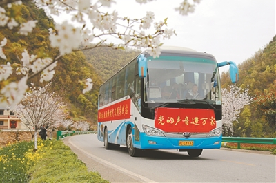 鄖陽區(qū)“流動(dòng)新時(shí)代文明實(shí)踐站”大巴車行駛在鄉(xiāng)村道路上。(鄖陽區(qū)委宣傳部供圖)