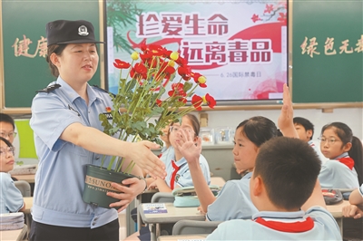 6月23日,浙江省湖州市德清縣乾元鎮(zhèn)清溪小學(xué)開展“珍愛生命 遠離毒品”教育活動,學(xué)生通過了解毒品的種類及其危害,提高識毒、防毒、拒毒的意識和能力。圖為德清縣公安局乾元派出所民警用仿真罌粟花與學(xué)生互動,教他們認識毒品原植物罌粟,了解罌粟的危害。倪立芳 沈偉平 攝