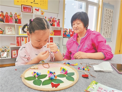 在太原玉園南社區(qū)“老幼共托”服務(wù)陣地,一位老人結(jié)束繪畫課程后,陪同孫子做手工。(玉園南社區(qū)供圖)