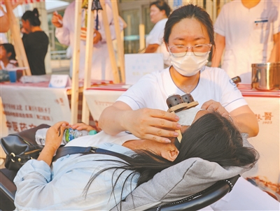 6月23日,河北港口集團(tuán)秦皇島中西醫(yī)結(jié)合醫(yī)院(港口醫(yī)院)舉辦的第二屆中醫(yī)藥文化節(jié)暨 “青春‘仲’夏夜,岐黃潤心田”中醫(yī)藥文化夜市拉開帷幕。圖為當(dāng)天,醫(yī)護(hù)人員帶領(lǐng)市民體驗(yàn)中醫(yī)眼灸療法。曹建雄 攝