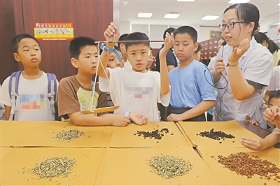 7月15日,浙江省湖州市南太湖新區(qū)仁皇山街道社工站聯(lián)合湖州市中醫(yī)院組織暑托班孩子走進(jìn)市中醫(yī)院,學(xué)習(xí)中醫(yī)知識(shí),感受傳統(tǒng)中醫(yī)藥文化的魅力。圖為孩子們?cè)谥嗅t(yī)師指導(dǎo)下學(xué)習(xí)稱(chēng)中藥材。鄧德華 攝