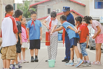 近日,在四川省樂(lè)山市市中區(qū)海棠街道王浩兒社區(qū)愛(ài)心暑托班活動(dòng)中,孩子們?cè)跇?lè)山市消防救援支隊(duì)消防員的指導(dǎo)下,學(xué)習(xí)滅火器的使用方法。李華時(shí) 攝