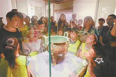 7月19日,福建省福州市“合探科技秘境 眾繪科學(xué)藍(lán)圖”主題暑假研學(xué)活動(dòng)在福建博物院舉行,青少年走進(jìn)博物院參觀大型文物展品,提高文物保護(hù)意識(shí)。圖為青少年在志愿者帶領(lǐng)下觀賞文物展品。謝貴明 攝