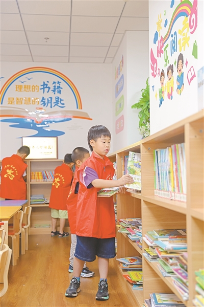 7月21日,山東省青島市李滄區(qū)世園街道金水東路社區(qū)城市書(shū)房開(kāi)展“我是小小圖書(shū)管理員”志愿服務(wù)活動(dòng),學(xué)生志愿者幫助圖書(shū)管理員整理圖書(shū),維持閱讀秩序,豐富暑假生活。張鷹 攝