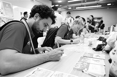 外國運(yùn)動(dòng)員書寫明信片。(新都融媒體中心供圖)