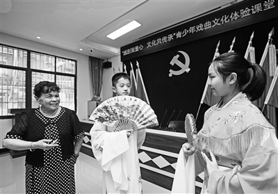 8月19日,安徽省蕪湖市鏡湖區(qū)荷塘社區(qū)黨委和關(guān)工委在暑托班,舉辦“”青少年戲曲文化體驗課堂。社區(qū)老年學(xué)校張慶華老師以通俗易懂的方式,講述了越劇的歷史淵源、演出形式、唱腔特點等內(nèi)容,讓參加學(xué)習(xí)的孩子們對越劇有了更加深入的了解和熱愛。圖為穿著戲服的孩子模仿張老師學(xué)習(xí)“眼隨手動”的身段。戚良鵬 張婷 攝