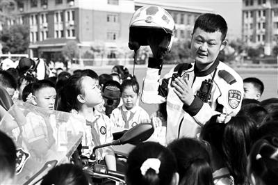 9月1日,山東省棗莊市各中小學(xué)迎來(lái)新學(xué)期開(kāi)學(xué)第一天。公安、檢察院、法院等部門聯(lián)合組織干警走進(jìn)校園,為學(xué)生上好法治“第一課”,增強(qiáng)學(xué)生們的法治觀念和自我保護(hù)意識(shí)。圖為當(dāng)天,棗莊市公安局市中分局交通管理大隊(duì)鐵騎隊(duì)員在東湖小學(xué)向?qū)W生們普及交通安全知識(shí)。 吉喆 楊列元 攝