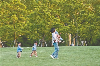 家長(zhǎng)帶著小朋友在上海世紀(jì)公園草地上玩耍。 朱偉輝 攝