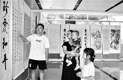 9月3日,湖南省永州市江永縣舉辦抗戰(zhàn)主題書畫展覽,展出110幅書畫作品,讓觀眾在藝術熏陶中銘記歷史、緬懷先烈,傳承弘揚偉大抗戰(zhàn)精神。圖為市民欣賞書畫展作品。田如瑞 攝