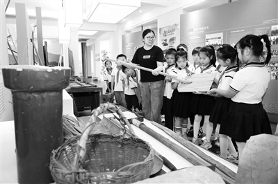9月16日,江蘇省連云港市連云區(qū)開展以傳承淮鹽文化為主題的社科知識(shí)普及活動(dòng)。學(xué)生們?cè)谥驹刚叩膸ьI(lǐng)下走進(jìn)新落成的淮鹽文化展館,參與“鹽之溯源”“鹽之創(chuàng)想”等實(shí)踐體驗(yàn)項(xiàng)目,了解古老的海水煮鹽和現(xiàn)代灘曬制鹽工藝、鹽運(yùn)商貿(mào)等淮鹽產(chǎn)業(yè)發(fā)展歷程。圖為小學(xué)生了解傳統(tǒng)曬鹽工具。