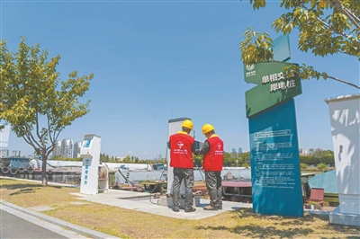 國(guó)網(wǎng)湖州供電公司工作人員前往城東水上服務(wù)區(qū)檢查岸電充電樁。沈媛 攝