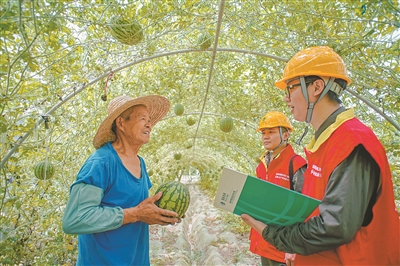 國(guó)網(wǎng)湖州供電公司紅船黨員服務(wù)隊(duì)隊(duì)員前往西瓜種植基地開(kāi)展用電安全宣傳。陳妍宏 攝