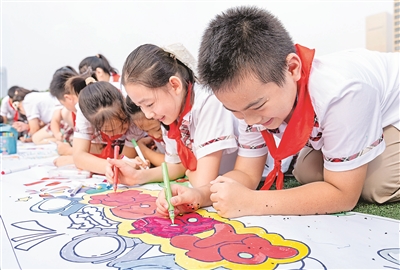 國慶節(jié)臨近,江蘇省海安市城南實驗小學(xué)舉行“彩繪畫卷迎國慶”活動。學(xué)生們在畫布上盡情彩繪,表達(dá)對祖國的美好祝福,喜迎國慶節(jié)到來。翟偉凱 攝