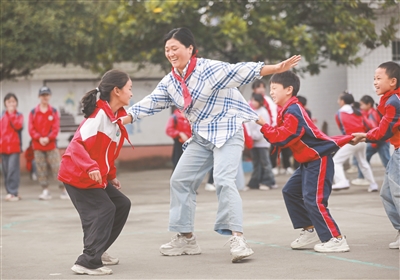 近年來,貴州省黔西市綠化白族彝族鄉(xiāng)培育小學常態(tài)化開展形式多樣、內容豐富的“多彩大課間”活動,結合學生興趣與學校特色推出創(chuàng)新項目,著力打造健康、快樂、充滿活力的校園文化。圖為10月13日,老師帶領學生們在大課間玩老鷹捉小雞游戲。