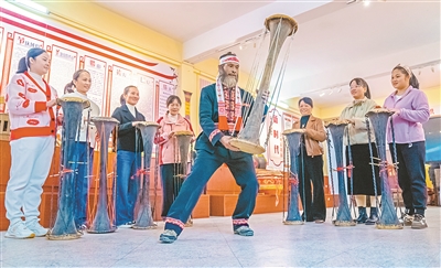 近年來,廣西來賓市金秀瑤族自治縣以非遺傳承基地、非遺工作室、非遺公益課堂等為載體開設(shè)專題培訓(xùn),通過“師徒結(jié)對+數(shù)字化教學(xué)”等模式,系統(tǒng)傳授非遺技藝。圖為11月11日,在金秀瑤族自治縣羅香鄉(xiāng)羅運(yùn)村黃泥鼓舞傳承基地,國家級非物質(zhì)文化遺產(chǎn)黃泥鼓舞代表性傳承人盤金海向金秀瑤族自治縣幼兒園的教師傳授黃泥鼓舞技藝。高如金 攝