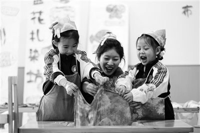 11月19日,四川省樂山市實(shí)驗(yàn)幼兒園至樂分園開展了“”活動?;顒又?,老師和孩子們一起體驗(yàn)扎染制作技藝,在邊玩邊學(xué)中了解非遺知識,感受中華優(yōu)秀傳統(tǒng)文化的魅力。圖為老師和孩子們在一起制作扎染布。李華時 攝