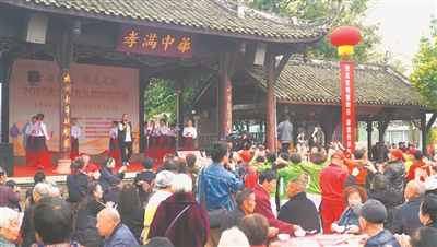 上午10點(diǎn),“千叟宴”尚未開(kāi)始,仁孝廣場(chǎng)上已經(jīng)熱鬧起來(lái):“德孝”主題的文藝節(jié)目輪番上演,精彩紛呈;書畫志愿者現(xiàn)場(chǎng)創(chuàng)作蘊(yùn)含“孝”意的書法作品贈(zèng)予現(xiàn)場(chǎng)群眾;攝影志愿者為村民拍攝全家福,定格一張張幸福笑臉。而在廣場(chǎng)一側(cè)的新時(shí)代文明實(shí)踐陣地——邛崍市當(dāng)代孝道文化博物館里,數(shù)十名學(xué)生認(rèn)真抄寫《孝經(jīng)》,不少村民、游客在這里了解當(dāng)代孝子的感人故事,傳承弘揚(yáng)德孝文化。據(jù)介紹,當(dāng)代孝道文化博物館自2014年重陽(yáng)節(jié)創(chuàng)立以來(lái),秉持“傳播孝道文化、促進(jìn)社會(huì)和諧”的宗旨,以文字、圖片、影像、實(shí)物等形式集中展現(xiàn)當(dāng)代孝子的感人故事,并免費(fèi)開(kāi)放。截至目前,累計(jì)接待游客70萬(wàn)余人次。