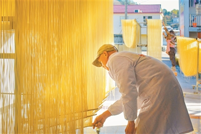 眼下,安徽省安慶市岳西縣手工掛面迎來產(chǎn)銷旺季,當?shù)厥炙嚾苏泳o制作,確保市場供應。近年來,岳西縣通過“公司+合作社+農(nóng)戶”的聯(lián)動模式,把岳西豆粑、手工掛面、手工粉絲等非遺項目與傳統(tǒng)手工藝品轉化為農(nóng)戶增收致富的特色產(chǎn)業(yè),實現(xiàn)傳承與發(fā)展雙贏,增加村民收入,助力鄉(xiāng)村全面振興。圖為12月3日,在岳西縣蓮云鄉(xiāng)珠屋村,村民在制作手工掛面。吳均奇 攝