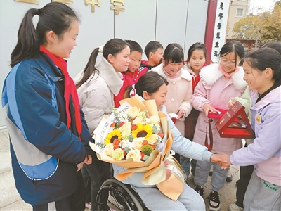 近日,“湖北省自強(qiáng)模范”、輪椅競(jìng)速運(yùn)動(dòng)員張園走進(jìn)湖北省竹山縣寶豐鎮(zhèn)寶豐中學(xué),開展題為“自強(qiáng)不息·筑夢(mèng)青春”的事跡報(bào)告會(huì),向2000余名師生分享了她十余年的奮斗歷程。圖為張園和孩子們互動(dòng)。