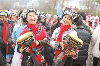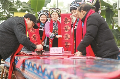 1月25日,貴州省畢節(jié)市黔西市的布依族文化活動在黔西市杜鵑街道烏騾壩社區(qū)舉行。活動現(xiàn)場,進行手鼓、山歌、民族舞蹈等表演,市書法家協(xié)會到場義寫春聯(lián),以文化活動的方式,迎接新春。圖①為布依族群眾在活動現(xiàn)場進行打手鼓表演。圖②為市書法家給布依族群眾義寫春聯(lián)。周訓超 攝