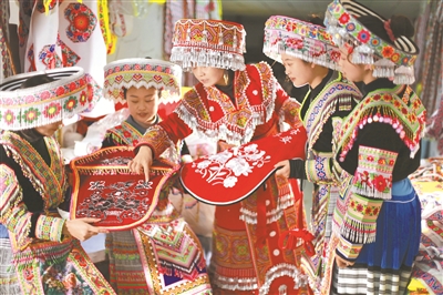 連日來,貴州省黔西市鐵石苗族彝族鄉(xiāng)工會為外來務工人員和返鄉(xiāng)大學生開展刺繡技能培訓,拓展就業(yè)渠道,助力當?shù)厝罕娋蜆I(yè)。圖為1月26日,黔西市鐵石苗族彝族鄉(xiāng)繡花車間,該市苗繡技藝傳承人陳敏(中)講解苗族服飾的花樣和分類。周訓超 攝