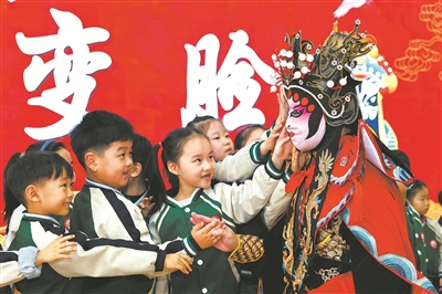 春節(jié)將至,山東省棗莊市市中區(qū)文化路絲雨幼兒園開(kāi)展“品民俗 迎新春”活動(dòng),讓孩子們?cè)谖椠?、變臉等豐富多彩的民俗體驗(yàn)中感受文化魅力。圖為1月26日,民間藝人在表演變臉時(shí)與小朋友互動(dòng)。
