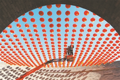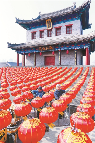 春節(jié)臨近,年味漸濃。2月2日,山東省青島市即墨古城張燈結(jié)彩,營(yíng)造喜慶祥和的節(jié)日氛圍,迎接新春佳節(jié)的到來。圖為工人在即墨古城懸掛燈籠。梁孝鵬 攝