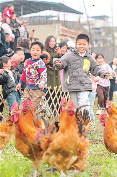 近日,四川省華鎣市古橋街道在回龍村舉辦“福馬當先,2026新征程”主題活動,孩子們和父母一起,參加抓雞、套圈、袋鼠跳、趕小馬等趣味項目。圖為孩子們參加抓雞比賽。邱海鷹 攝