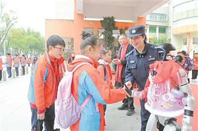 3月4日是浙江省東陽市中小學(xué)校開學(xué)首日,在東陽市吳寧第五小學(xué)校門口,東陽市公安局吳寧派出所民警與一個“類腦具身智能機器人”同時開展護學(xué)執(zhí)勤。這個機器人是東陽市保安服務(wù)有限公司與浙江大學(xué)聯(lián)合研發(fā),具有巡邏、語言互動、門崗登記等功能。圖為學(xué)生與機器人互動。