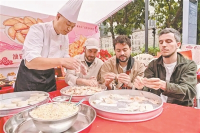 2月12日,外國(guó)友人在2026廣州水上花市開(kāi)市現(xiàn)場(chǎng)學(xué)習(xí)制作油角。畢志毅 攝