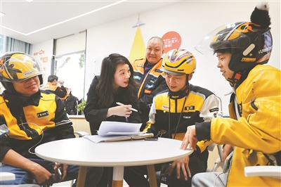 3月11日,位于重慶市沙坪壩區(qū)天星橋街道石碾盤社區(qū)的“星享匯”綜合惠民驛站正式啟用。驛站占地300平方米,集騎手友好驛站、工會(huì)驛站、“兩企三新”黨建陣地等功能于一體,為新就業(yè)群體、企業(yè)及居民提供飲水休憩、法律咨詢、職業(yè)培訓(xùn)等服務(wù)。圖為工作人員與外賣員互動(dòng)交流,收集意見(jiàn)建議。孫凱芳 攝