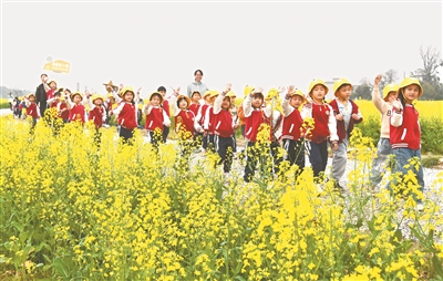 3月17日,湖南省永州市江永縣中心幼兒園組織小朋友來到接龍橋村油菜花田開展春游研學(xué)活動,讓孩子們親近大自然,感受春天的氣息,在歡聲笑語中增長知識,開闊眼界,啟迪智慧。圖為當(dāng)日,小朋友在油菜花田開心游玩。田如瑞 攝