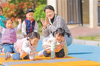 近年來,山東省青島市李滄區(qū)深入推進托幼一體化建設(shè),鼓勵和支持具備條件的幼兒園開設(shè)托班,為2-3歲嬰幼兒提供安全、優(yōu)質(zhì)的照護服務(wù),用心用情解決群眾帶娃難題。圖為4月7日,在李滄區(qū)青峰路幼兒園托育班內(nèi),幼兒在老師的指導下練體能。張鷹 攝