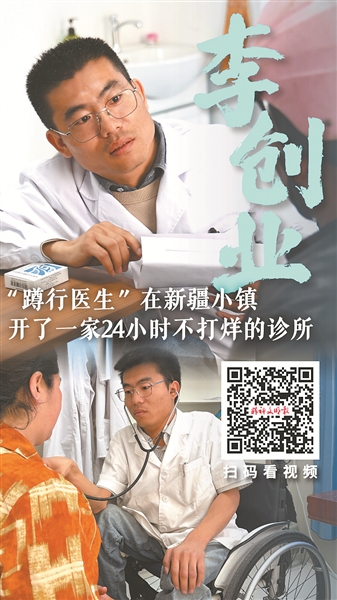 診所剛開業(yè)時,事務(wù)繁雜,李創(chuàng)業(yè)常常忙得一天只吃一個馕、喝一杯水。即便如此,他仍用心對待每一位患者。李創(chuàng)業(yè)平時多是蹲行,在給患者看病時,為了能與患者平視,他總會吃力地爬上輪椅,再挪到診桌前,趴在桌上給患者看病。